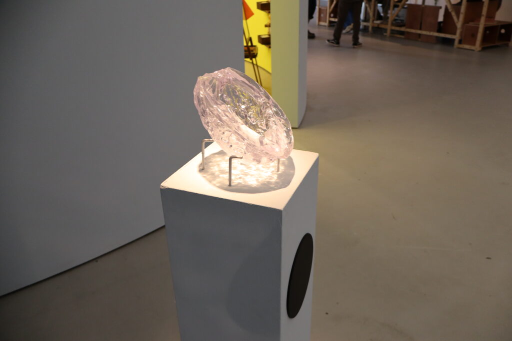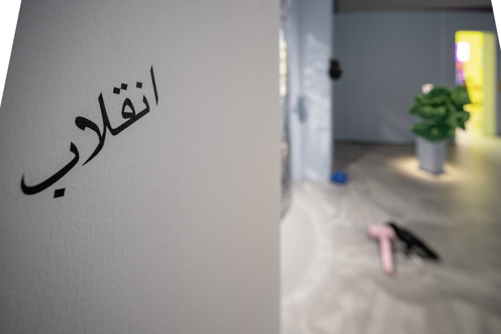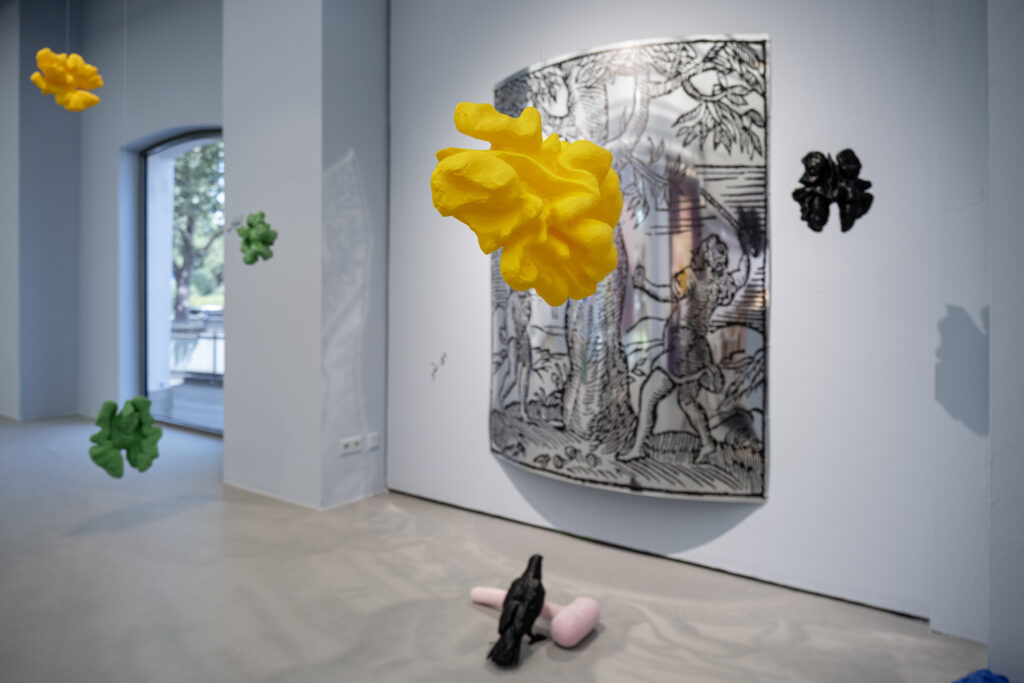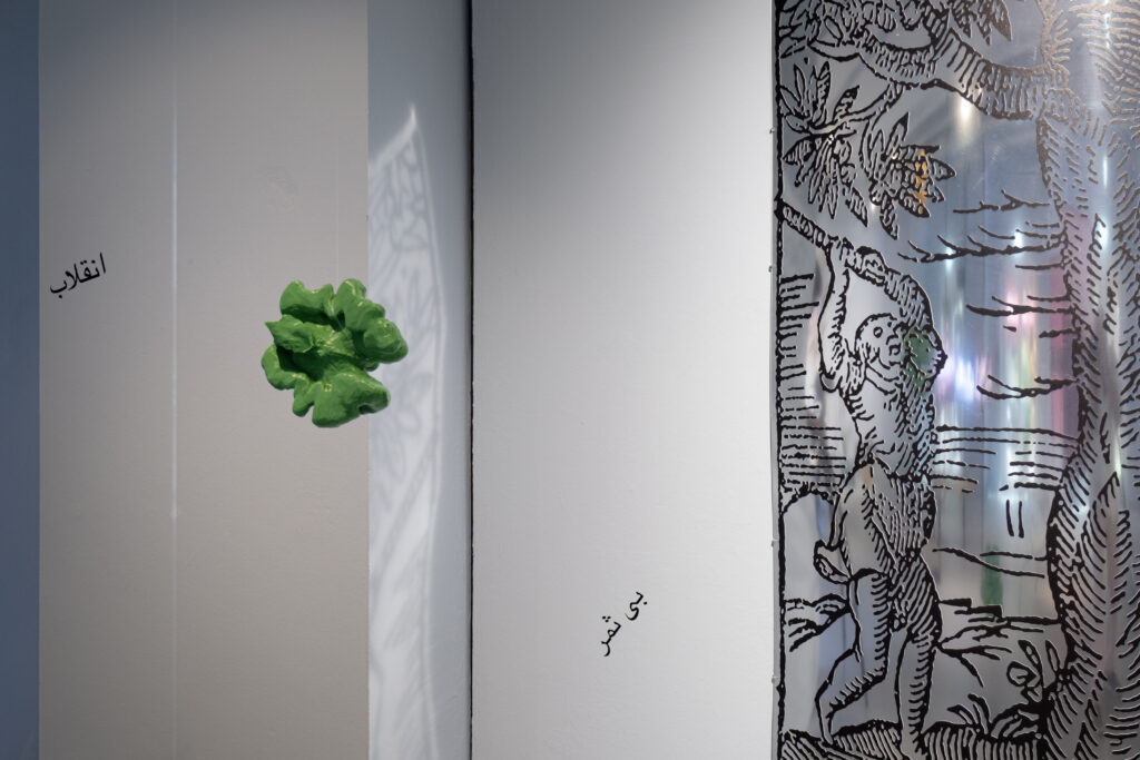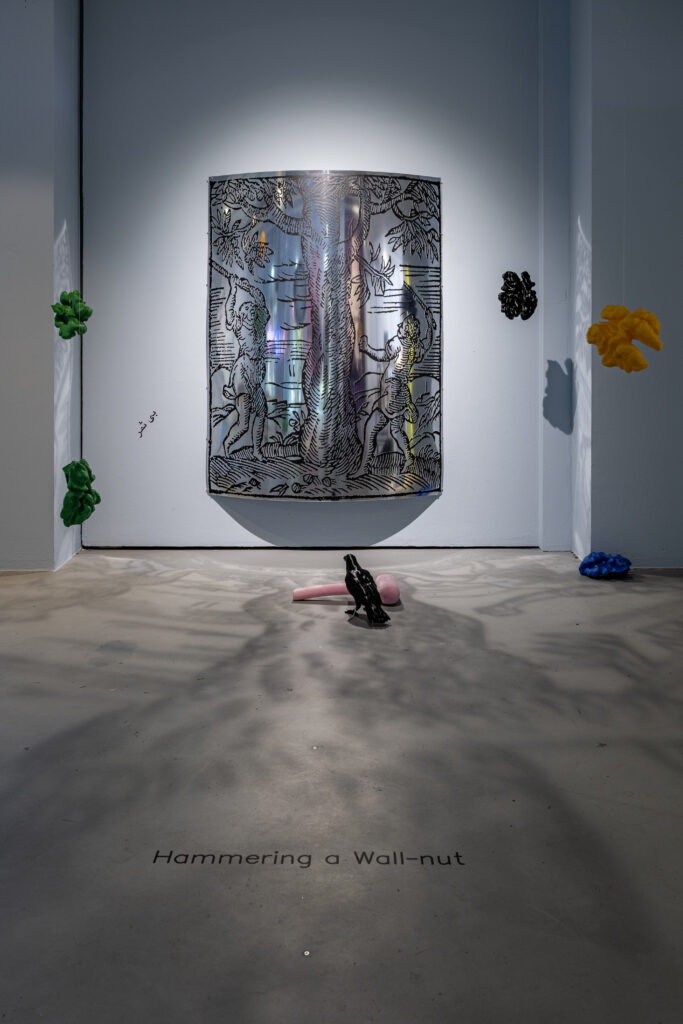 The installation Hammering a Wall-nut revolves around the reproduction of a 16th-century engraving by the Italian Andrea Alciato (1492-1550), a jurist and writer best known for his work Emblemata, a collection of allegories in Latin verse on moral subjects. The artist puts the engraving — which depicts two men striking a walnut tree to collect its nuts — in dialogue with proverbs, customs, and symbols that have associated walnuts with femininity since antiquity. According to one proverb, “the more you strike the walnut tree, the more fertile it becomes. “